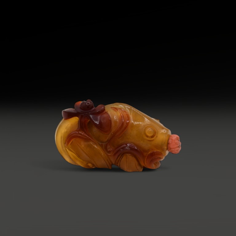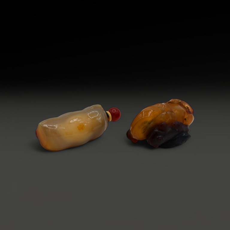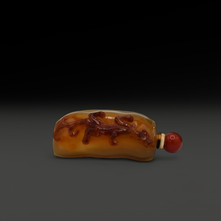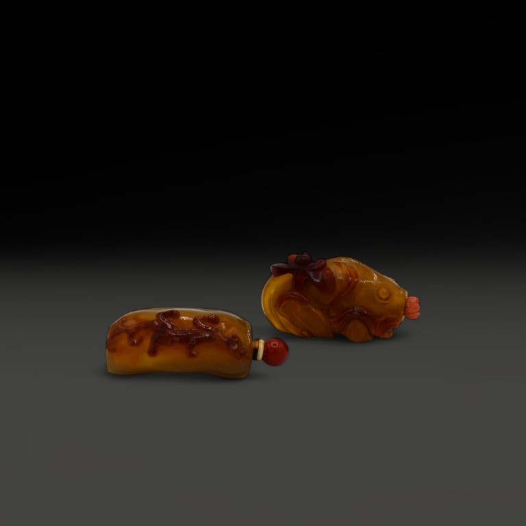 one carnelian carved snuff bottle with qilong and one simil carved amber snuff bottle.