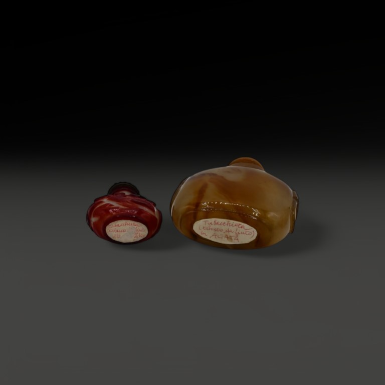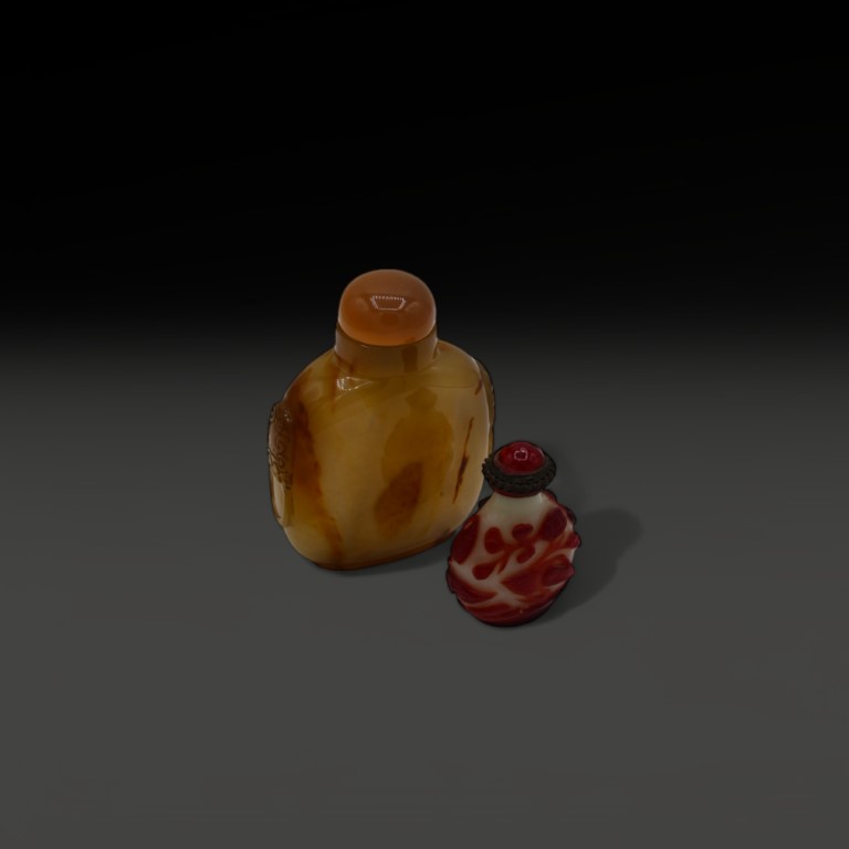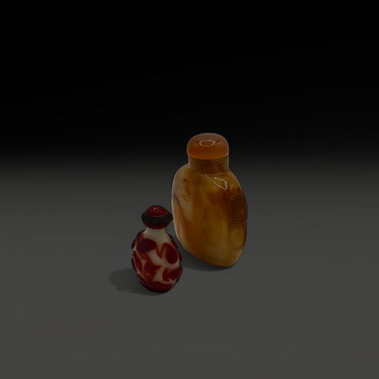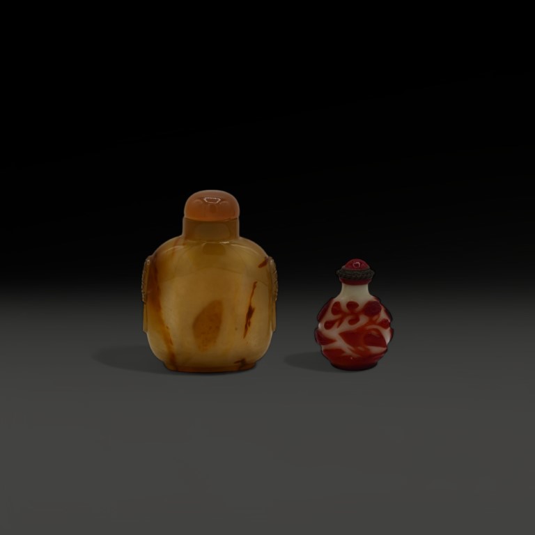 One peking glass snuff bottle and one large carnelian snuff bottle.