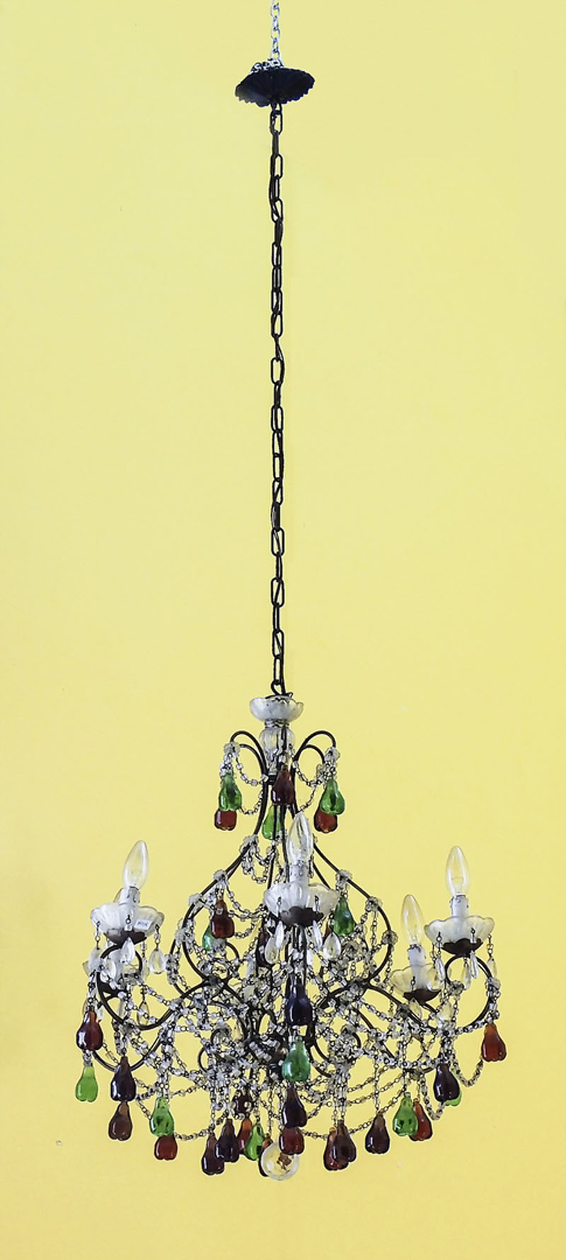 LAMPADARIO IN METALLO DORATO - GILDED METAL CHANDELIER sei bracci portacandele con catene di perle di vetro e pendenti multicolore modellati come frutti h cm 65