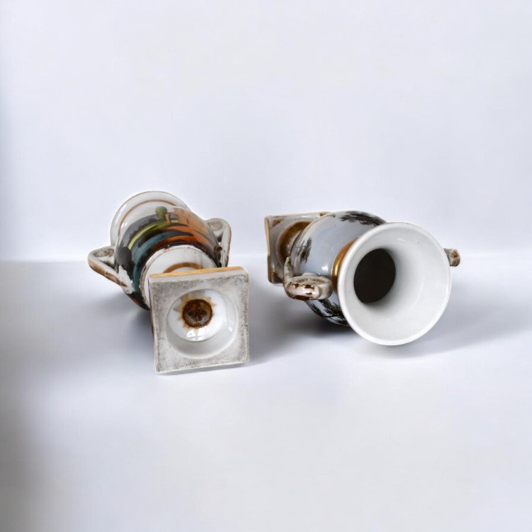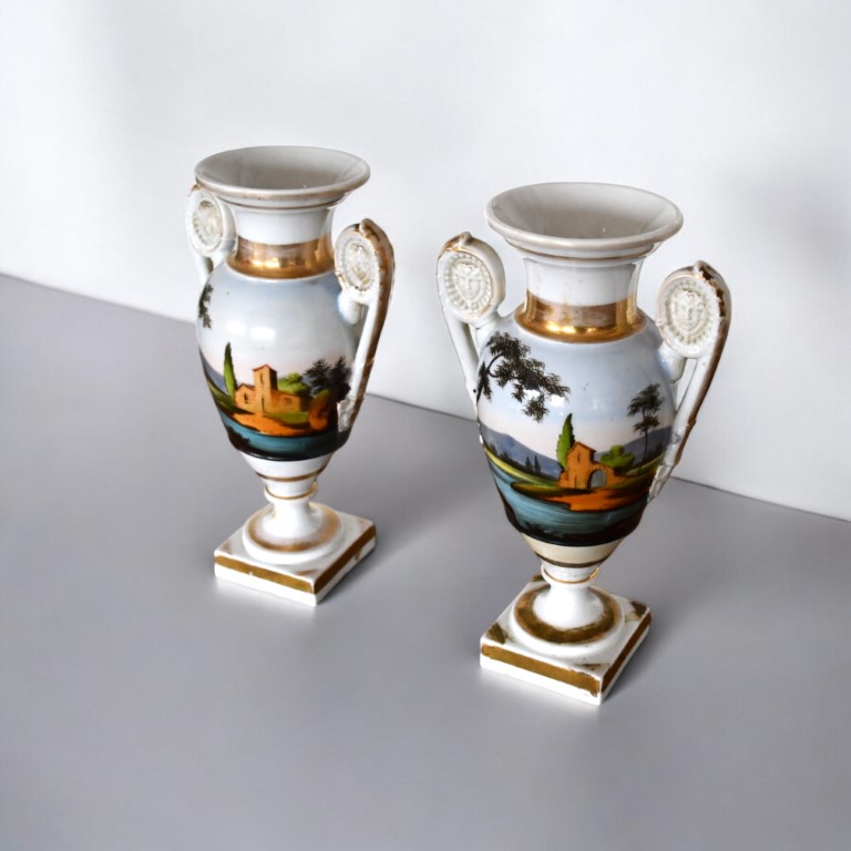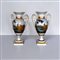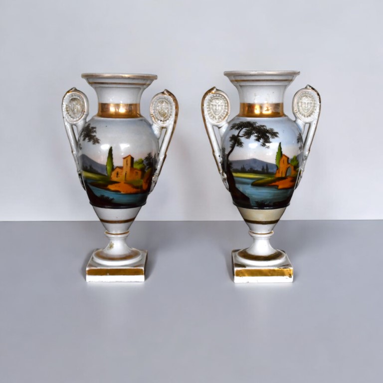 dipinti a paesaggi e lumeggiata in oro, anse con testa di Gorgone, base quadrangolare