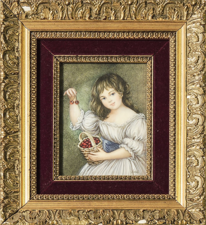 FANCIULLA CON CILIEGIE - GIRL WITH CHERRIS miniatura dipinta - painted miniature, in cornice cm 11x8,5