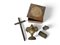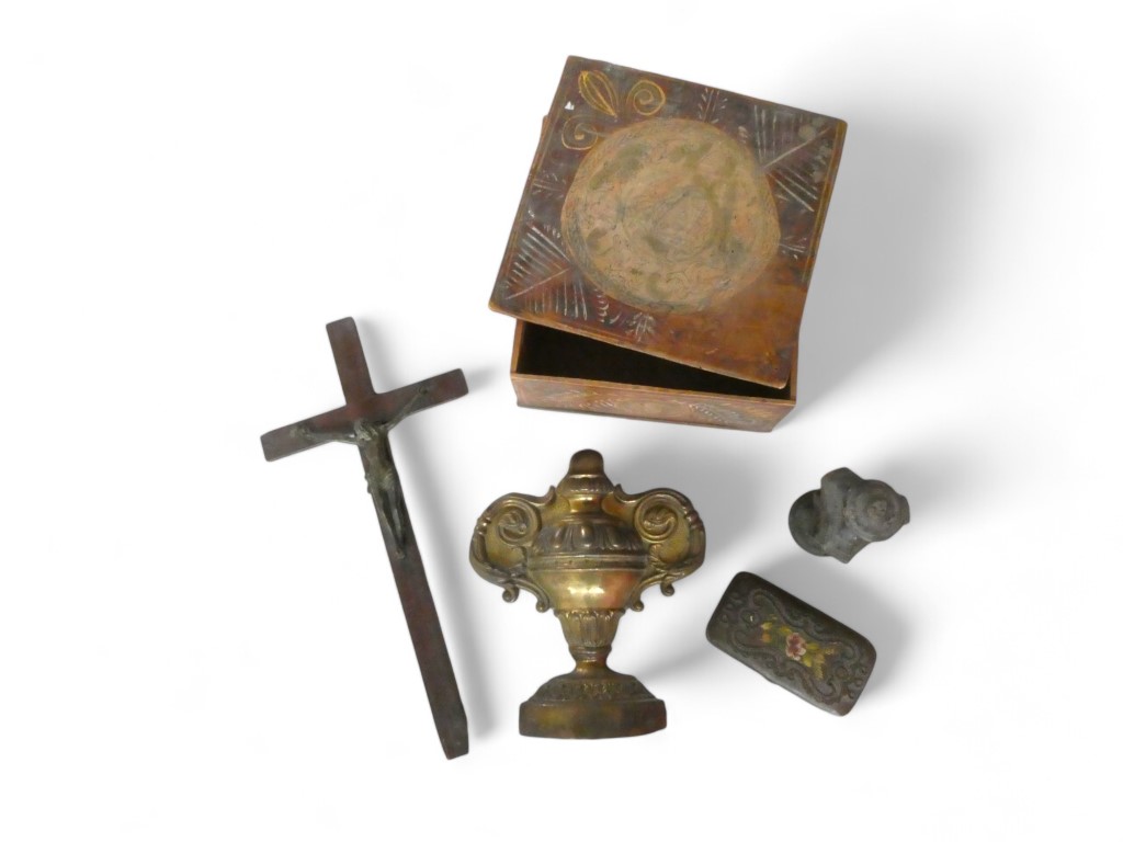 composto da: grande scatola in faggio dipinto con applicazioni in carta con stemma Medici, un portapalme in ottone sbalzato, un crocefisso in ottone, un perettone in legno intagliato perettone, un astuccio in pelle decorato con ricami e perline