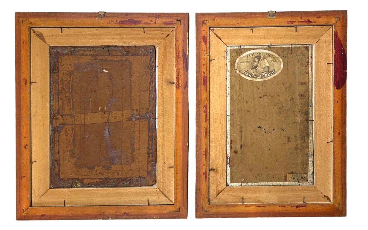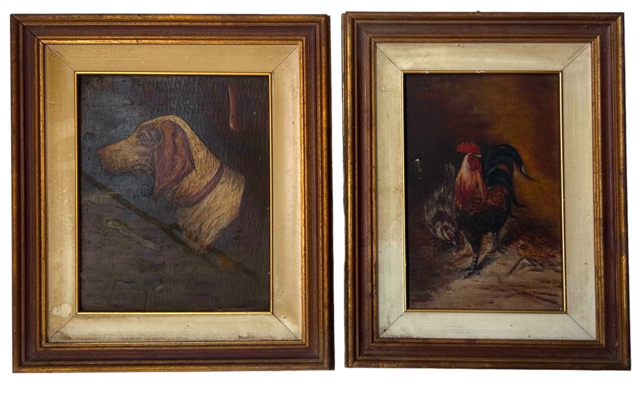 Coppia di quadretti raffiguranti un segugio e un gallo