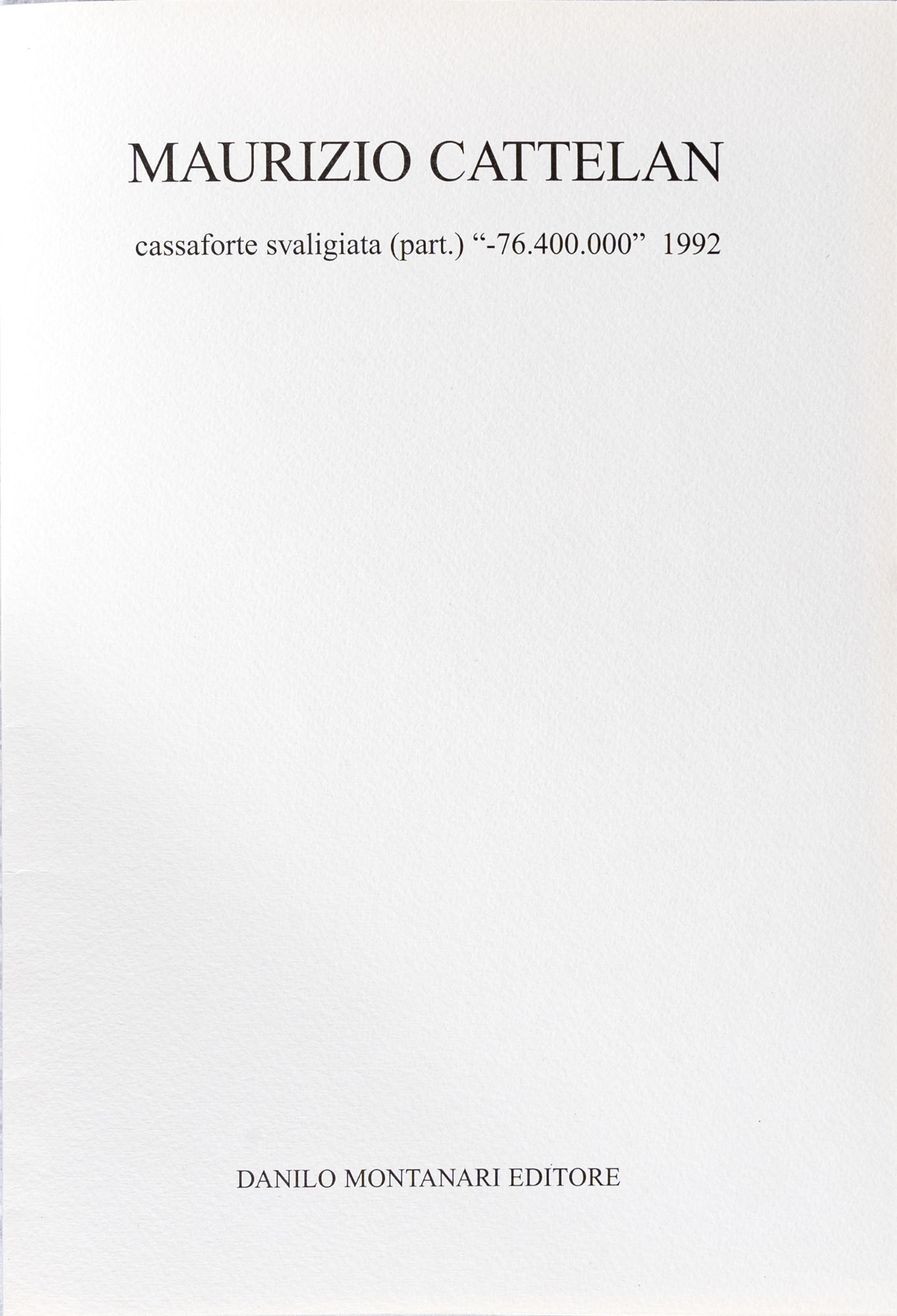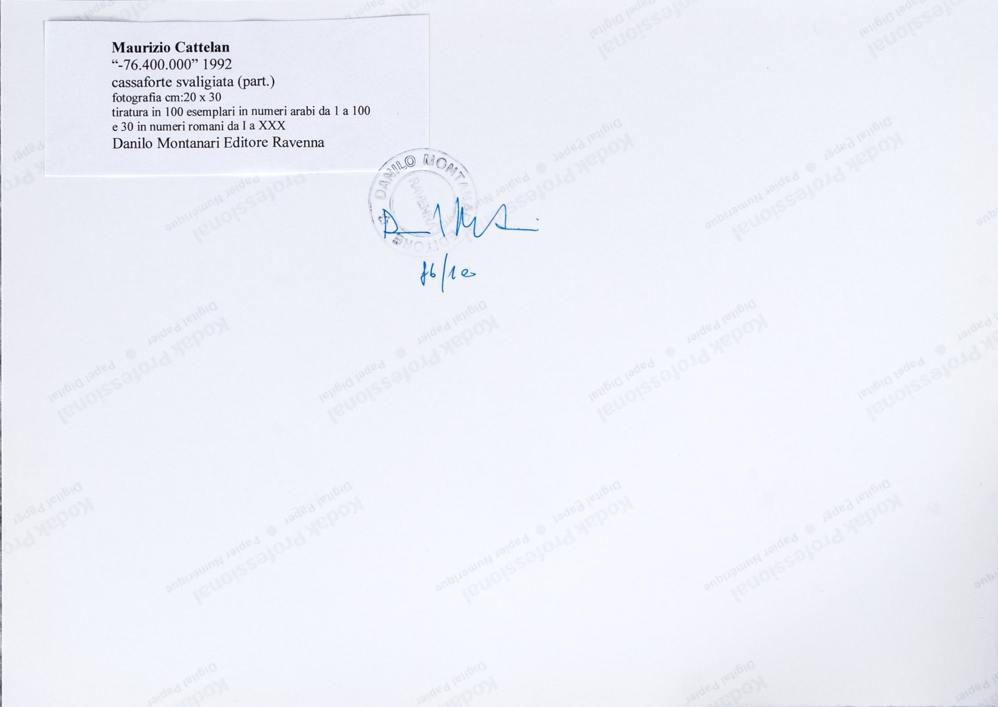 MAURIZIO CATTELAN(1960)Cassaforte svaligiata (part.) - 76.400.0001992Cartella contenente una stampa cibachrome, es. 86/100 su una tiratura complessiva di 100 esemplari in numeri arabi e 30 in numeri romani, Danilo Montanari Editore, RavennaDimensioni della cartella: 32 x 22 cmDimensioni della stampa cibachrome: 20 x 27,8 cmTimbro e firma Danilo Montanari Editore e numerazione al retro della stampa cibachromePROVENIENZA:Collezione privata, Milano