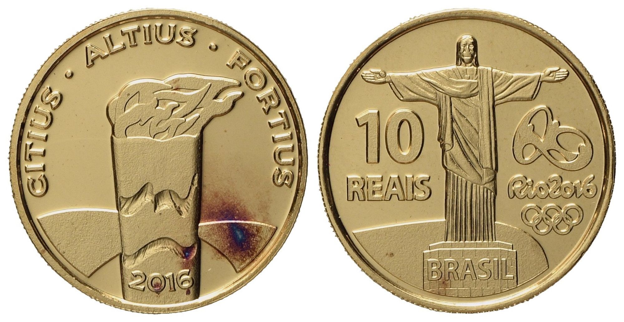 BRASILE. 10 Reais per i giochi olimpici estivi - Olimpiadi di Rio 2016. Au 900 (4,4 g; 16 mm)
