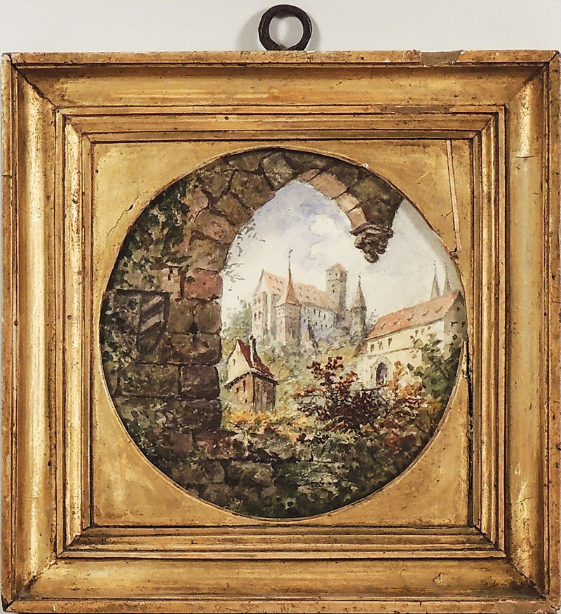 CORNICE D'EPOCA IN LEGNO DORATO - OLD GILTWOOD FRAME contenente acquerello su carta raffigurante Veduta di castello, difetti la luce diam cm 16