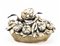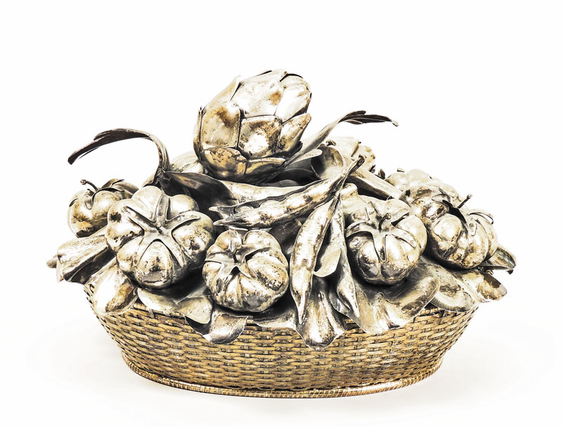 GRANDE CENTROTAVOLA IN ARGENTO - VEGETABLE SILVER CENTREPIECE Firenze, F.lli Lisi realizzato come un cestino con coperchio sovrastato da trionfo di verdure quali carciofi, pomodori, fagiolini e peperoncini gr 1700