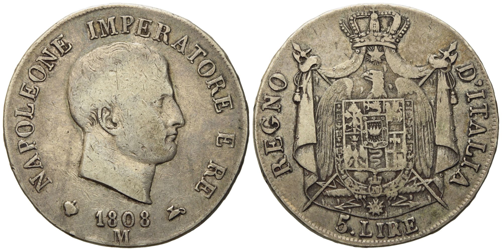 MILANO. Regno d'Italia. Napoleone I (1805-1814). 5 Lire 1808, I tipo. Ag (24,78 g; 36,5 mm)