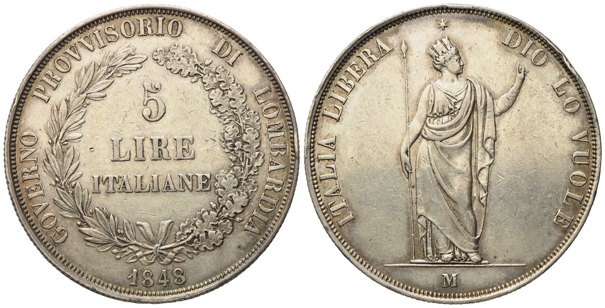 MILANO. Governo Provvisorio di Lombardia. 5 lire 1848 "Stella lontana, rami corti". Ag (24,92 g; 37,2 mm)