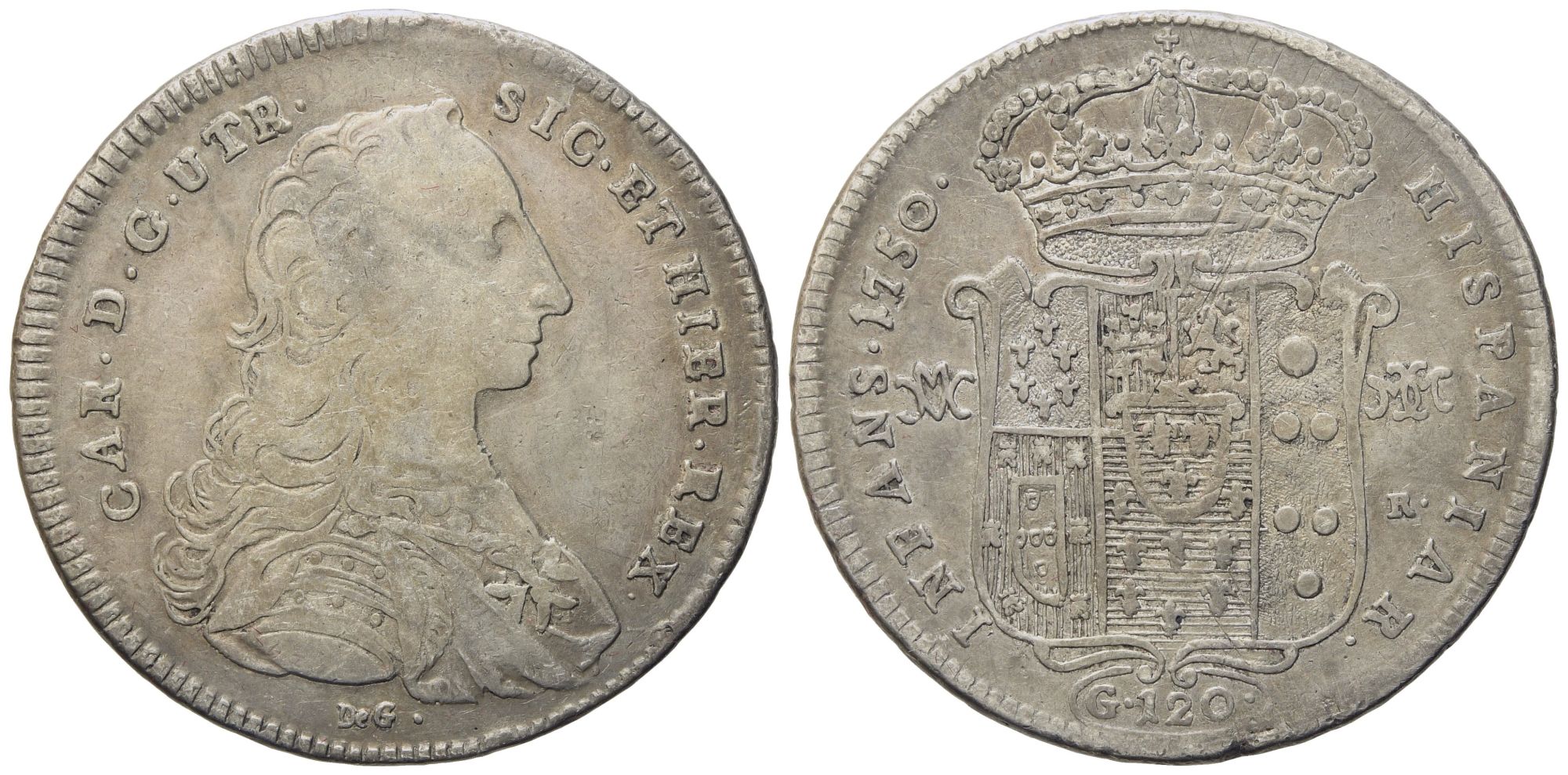 NAPOLI. Regno di Napoli. Carlo di Borbone (1734-1759). Piastra da 120 grana 1750 "De G sotto il busto. Ag (24,60 g; 42 mm)
