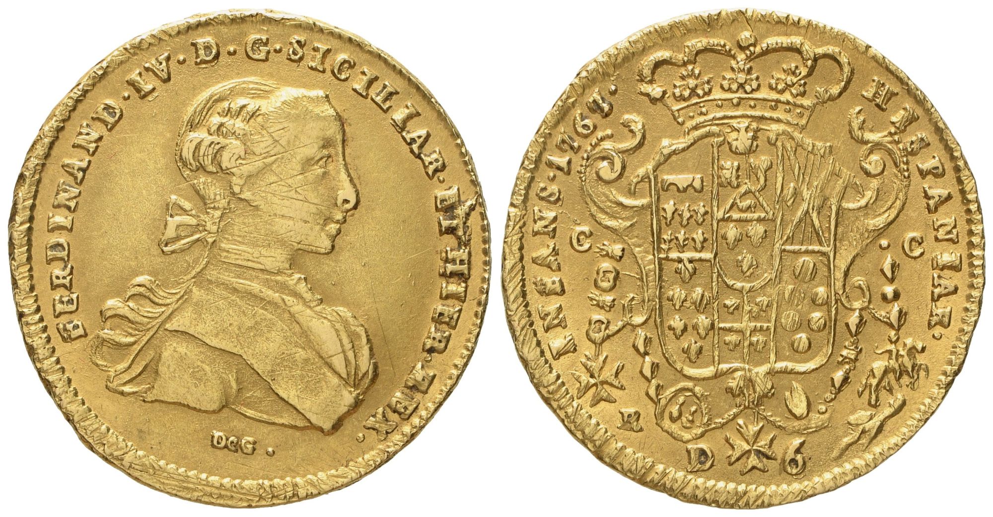 NAPOLI. Regno di Napoli. Ferdinando IV di Borbone (1759 - 1799 I periodo). 6 Ducati 1767. Au (8,8 g; 26,4 mm)
