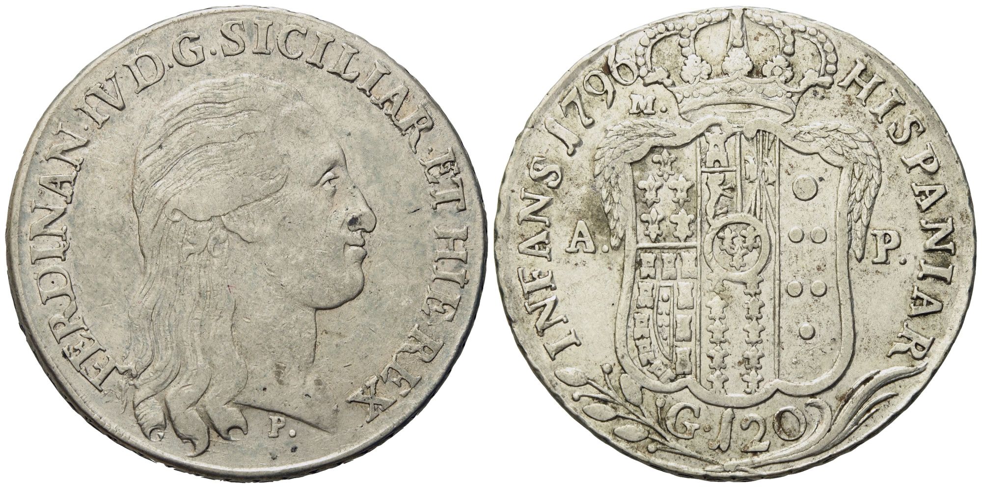 NAPOLI. Regno di Napoli. Ferdinando IV di Borbone (1759-1799 I periodo). Piastra da 120 grana 1796. Ag (27,45 g; 40,1 mm)