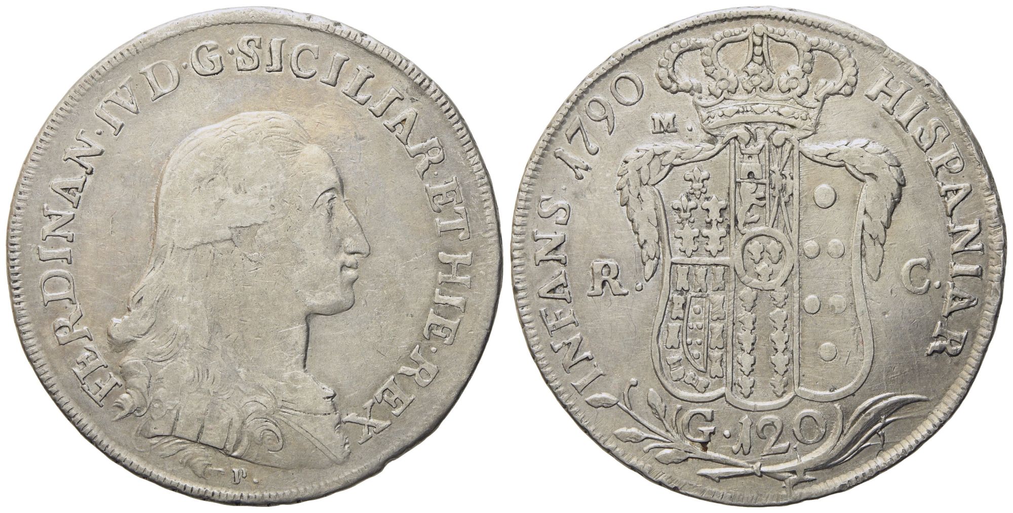 NAPOLI. Regno di Napoli. Ferdinando IV di Borbone (1759-1799, I per.). Piastra da 120 Grana 1790 "R.C". Ag (27,09 g; 42,4 mm).