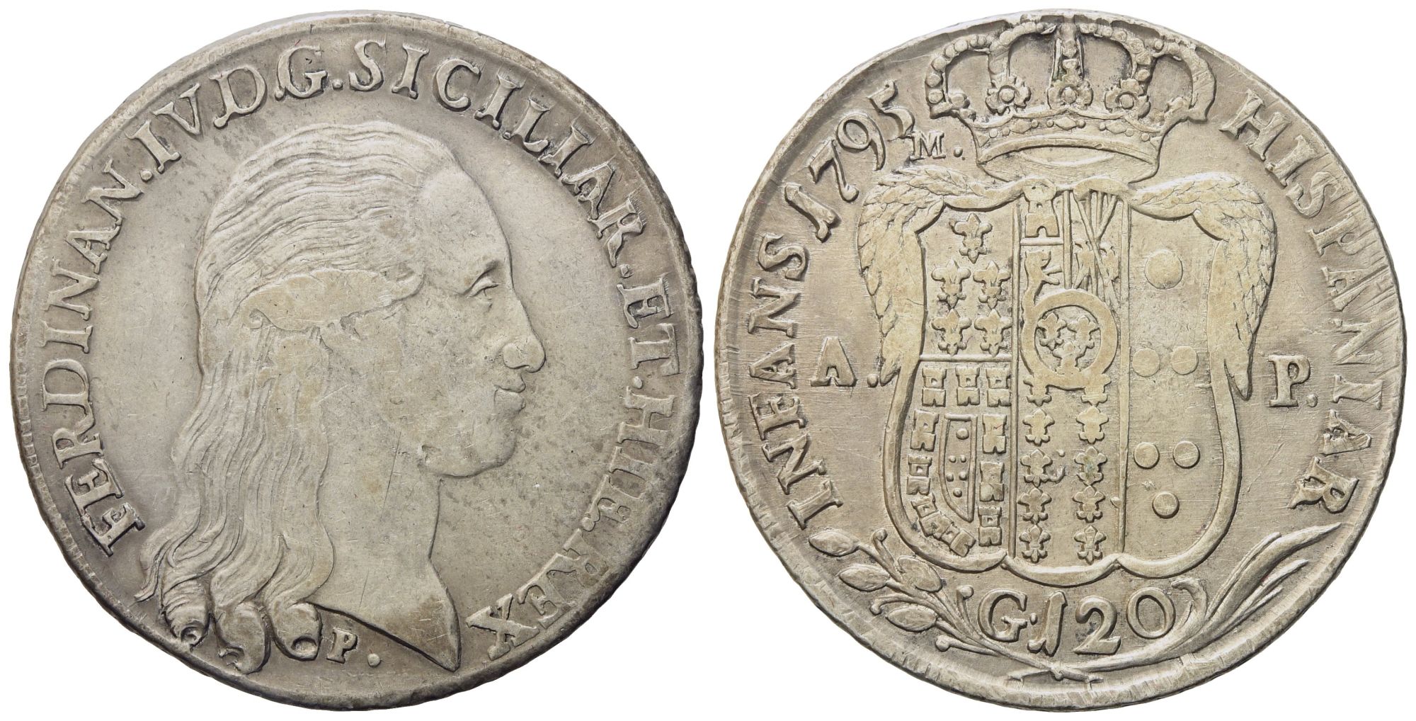 NAPOLI. Regno di Napoli. Ferdinando IV di Borbone (1759-1799, I per.). Piastra da 120 grana 1795. Ag (27,40 g; 39,5 mm)
