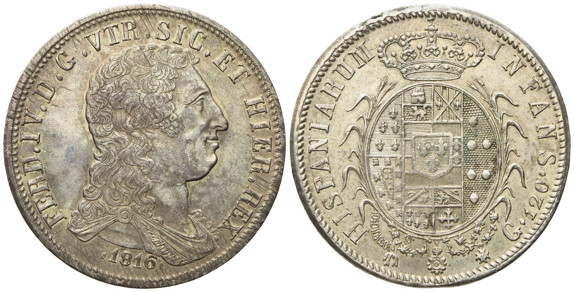 NAPOLI. Regno di Napoli. Ferdinando IV di Borbone (1815-1816 - III periodo). Piastra da 120 grana 1816. Ag (27,54 g; 37,2 mm)