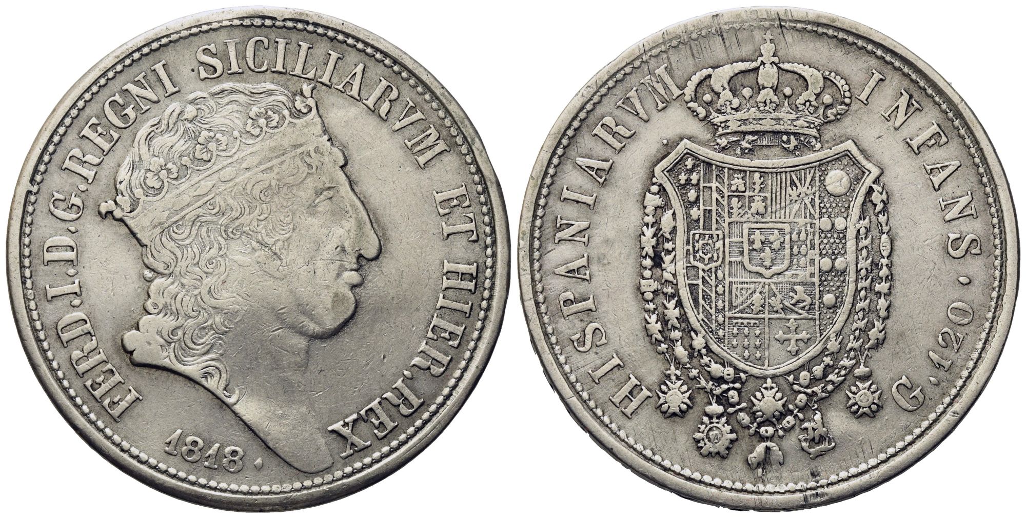 NAPOLI. Regno delle Due Sicilie. Ferdinando I di Borbone (1816-1825 IV periodo). Piastra 120 grana 1818 - testa grande. Ag (27,4 g; 37,5 mm)