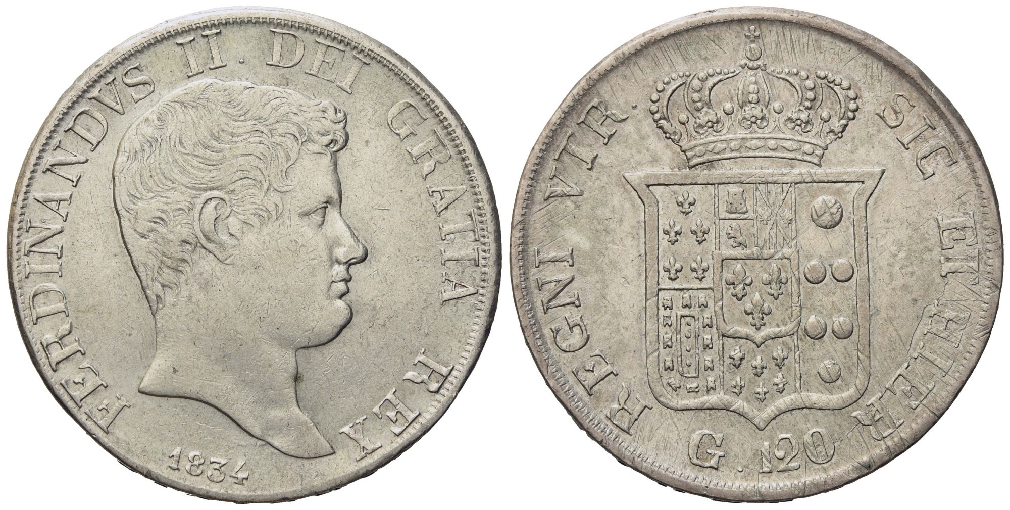 Lotto 200 | NAPOLI. Regno delle Due Sicilie. Ferdinando II di Borbone (1830-1859). Piastra da 120 grana 1834. Ag (27,43 g; 37,2 mm)