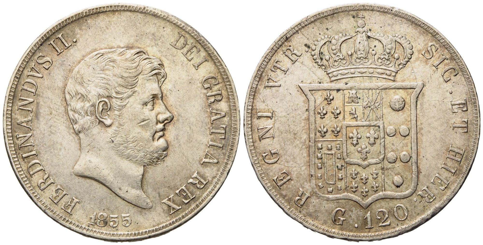 NAPOLI. Regno delle Due Sicilie. Ferdinando II di Borbone (1830-1859). Piastra da 120 Grana 1855. Ag (27,58 g; 36,8 mm)