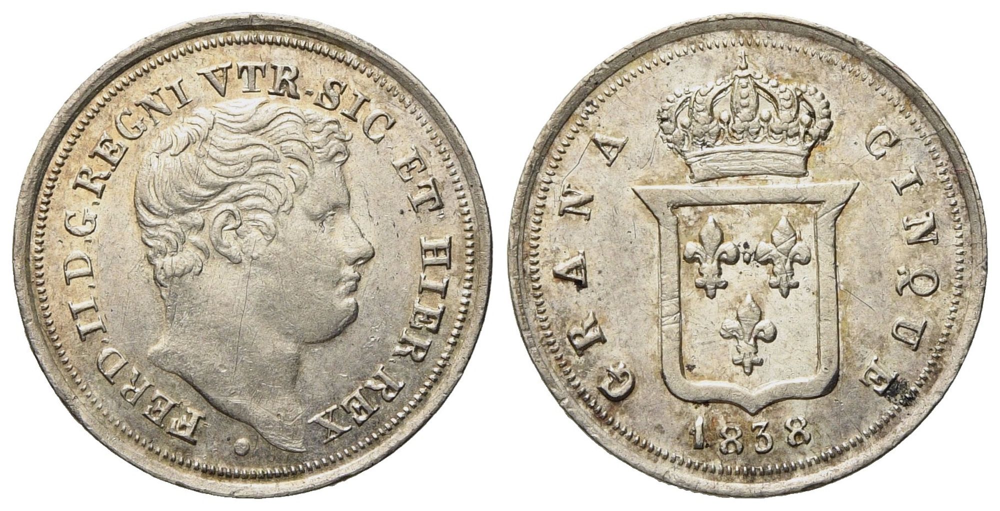 NAPOLI. Regno delle Due Sicilie. Ferdinando II di Borbone (1830-1859). Mezzo carlino da 5 grana 1838. Ag (1,13 g; 16,3 mm)