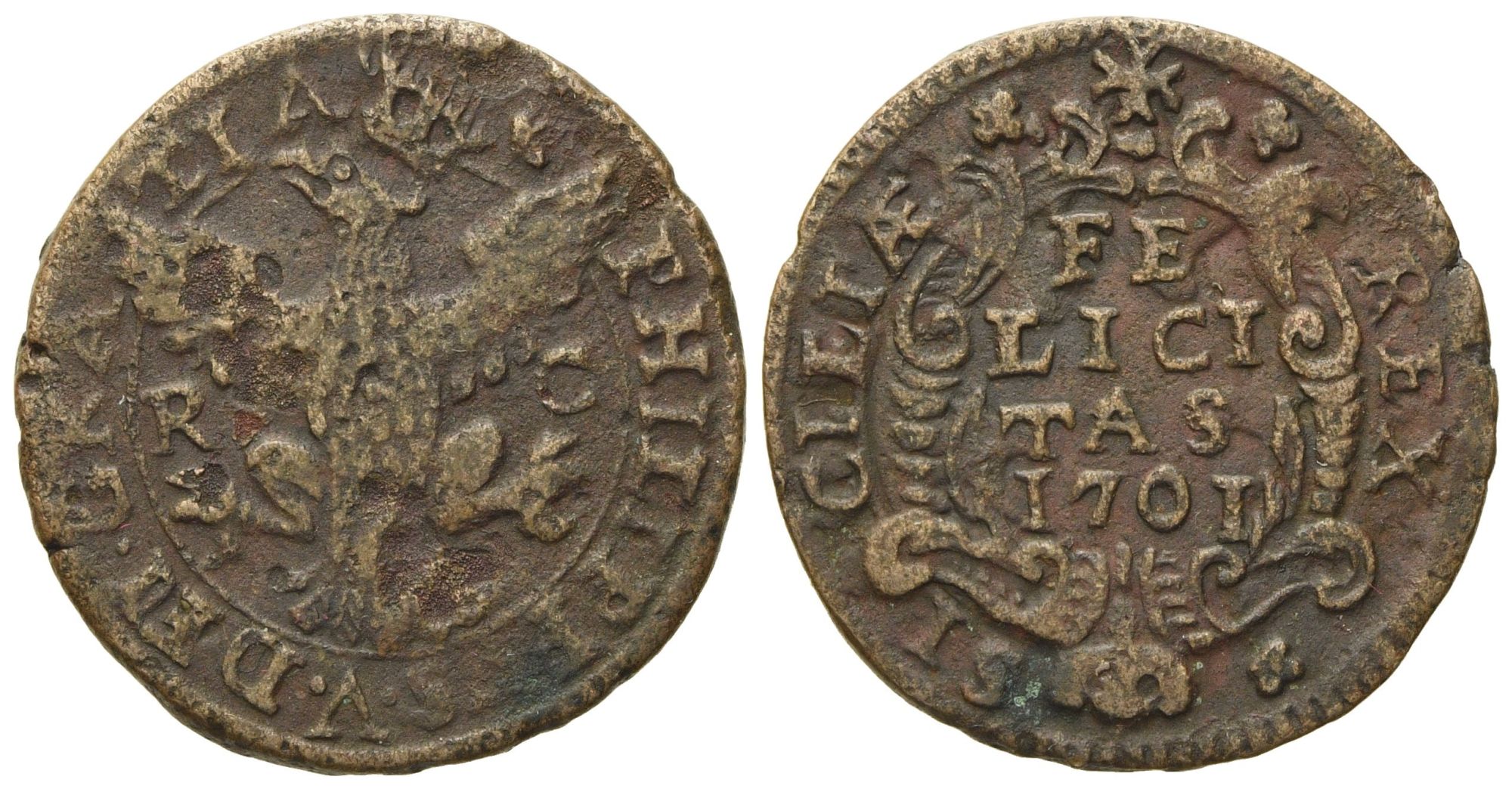 Palermo. Regno di Sicilia. Filippo V di Borbone (1701-1713). Grano 1701. Cu (5 g; 23,5 mm)