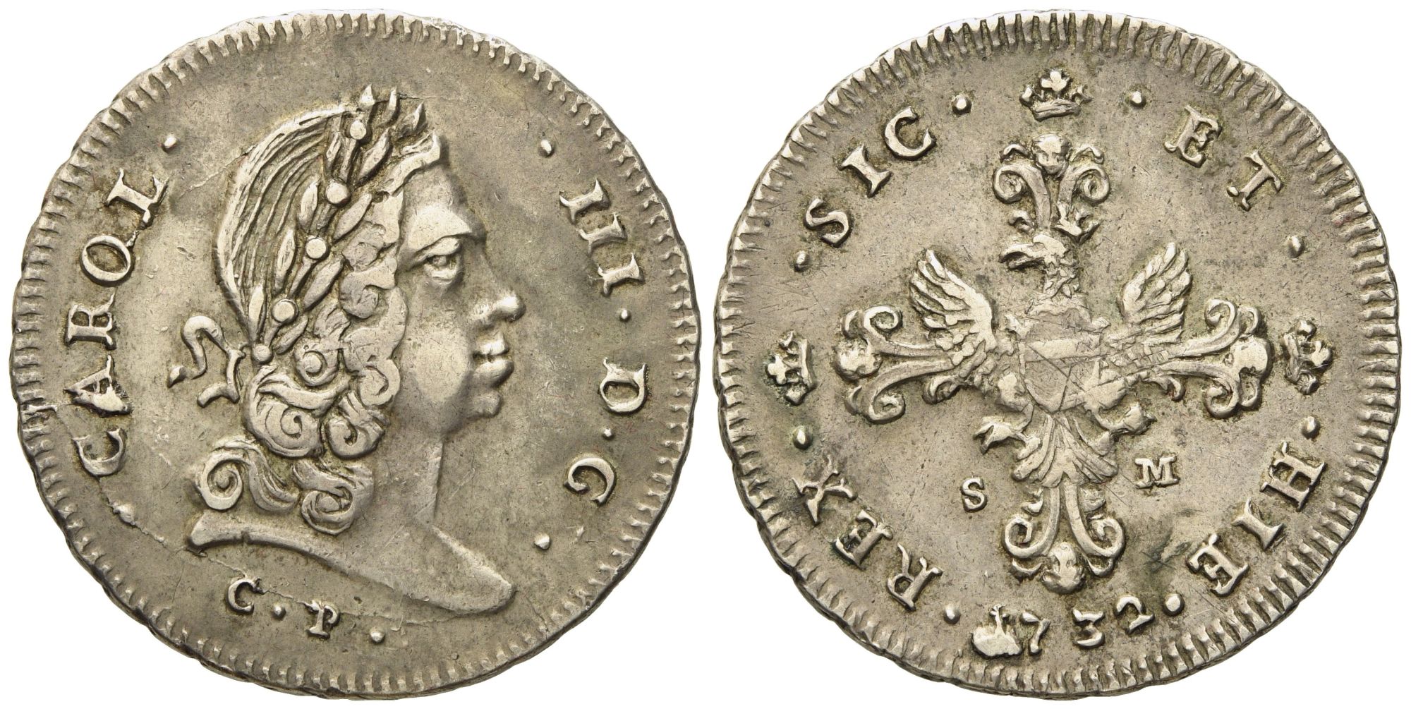 Palermo: Regno di Sicilia. Carlo III (VI) d'Asburgo (1720-1734). 6 tarì 1732. Ag (14,62 g; 34,3 mm)