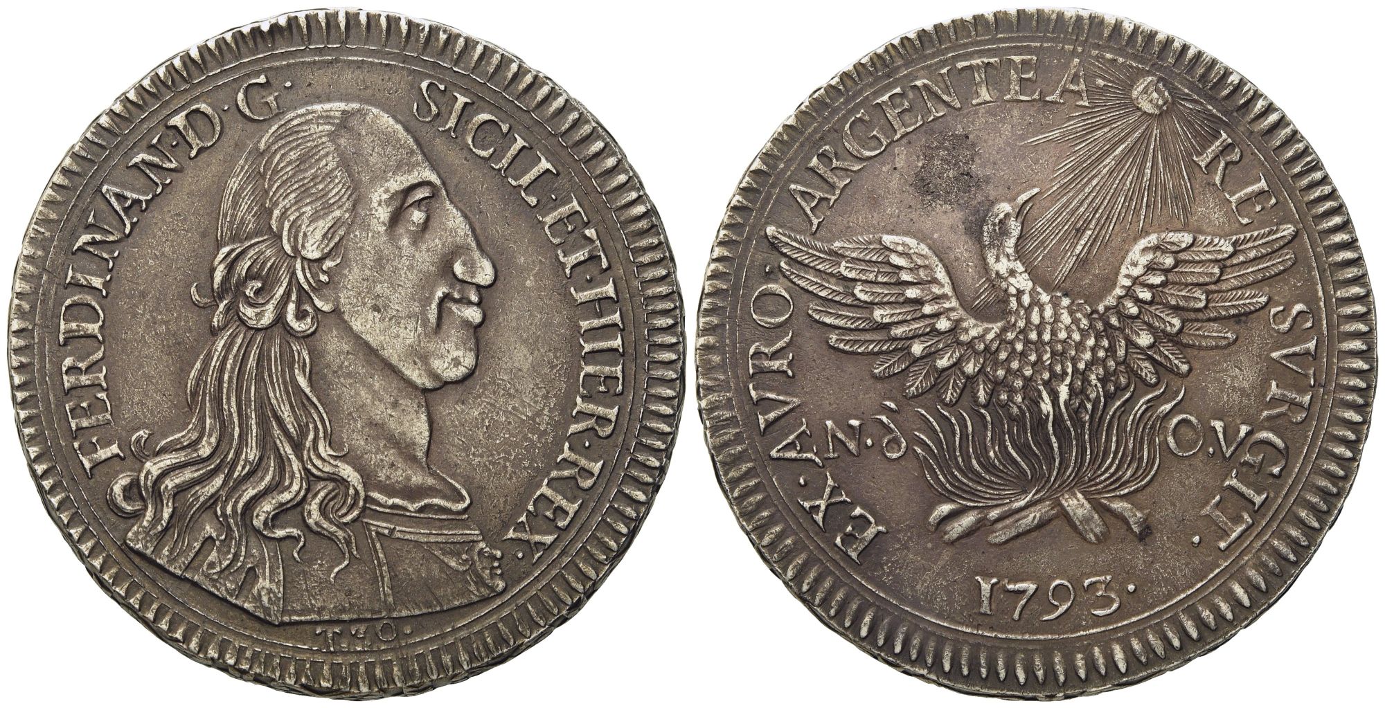PALERMO. Regno di Sicilia. Ferdinando III di Borbone (1759 - 1816). Oncia da 30 tarì 1793. Tipologia rarissima con il sole volto a destra. Ag (68,35 g; 48,4 mm)