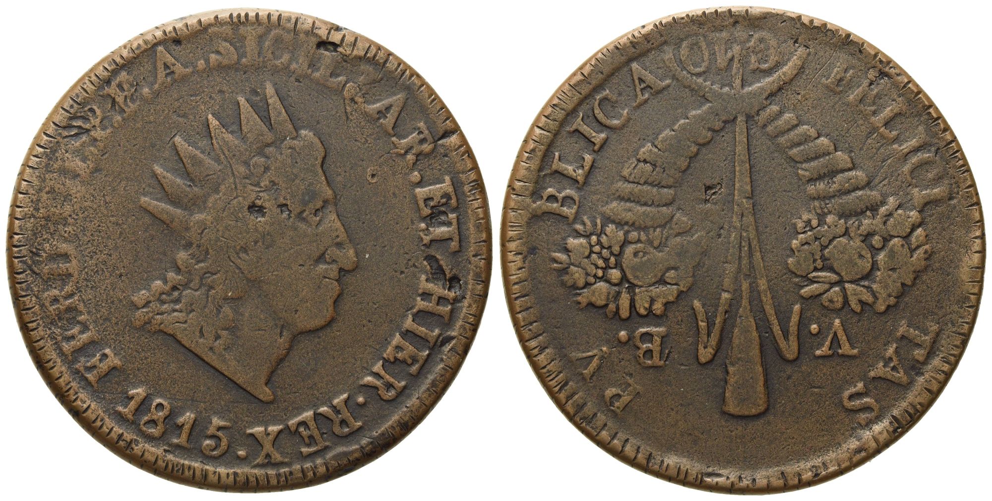 PALERMO. Regno di Sicilia. Ferdinando III di Borbone (1759 - 1816). 10 Grani 1815. Cu (27,20 g; 36,8 mm)