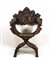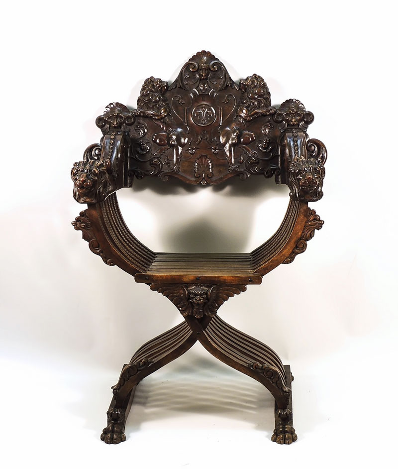 POLTRONA SAVONAROLA IN NOCE - SAVONAROLA WALNUT ARMCHAIR inizio del XX secolo - early 20th Century schienale intagliato con coppia di leoni rampanti, mascheroni e medaglione con giglio, braccioli con finali a foggia di teste di leone,piedi a zampa leonina