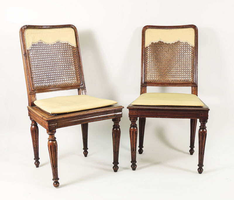 COPPIA DI SEDIE IN NOCE - PAIR OF WALNUT CHAIRS schienali e sedute rivestite in paglia di Vienna, gambe a faretra scanalata, corredate di cuscino in seta gialla, difetti