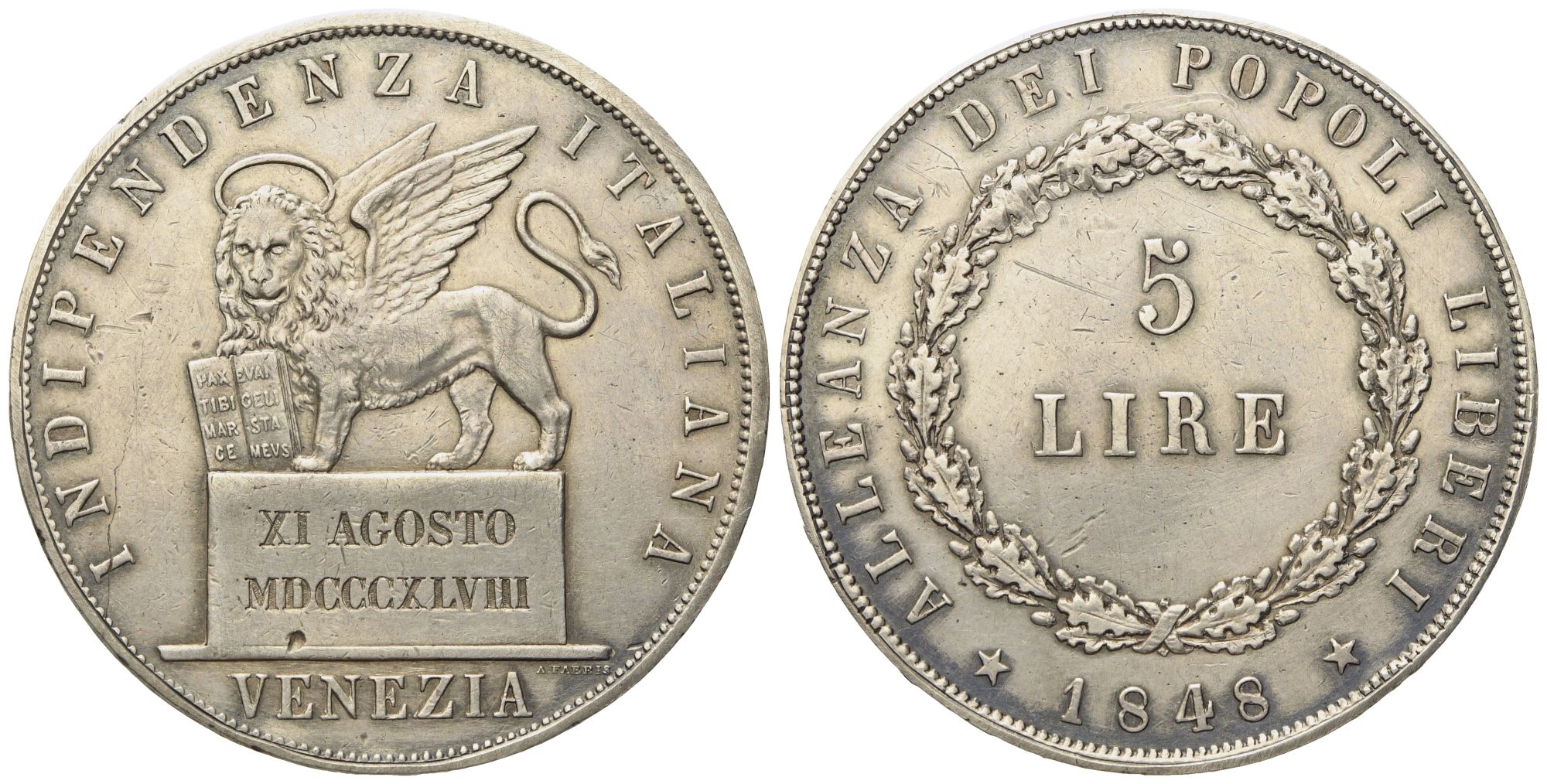 VENEZIA. Governo Provvisorio di Venezia (1848-1849). 5 Lire 1848 - II tipo "XI agosto". Ag (24,84 g; 37,3 mm)