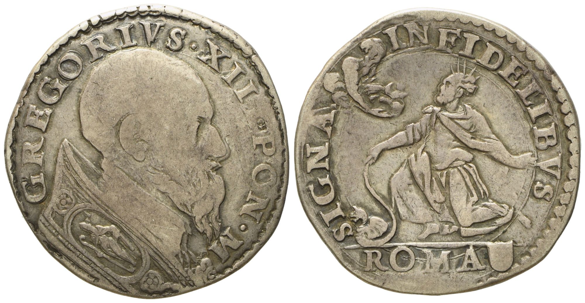 STATO PONTIFICIO. Roma. Gregorio XIII (1572 - 1585). Testone "Mosè inginocchiato". Ag (9,2 g; 29 mm)