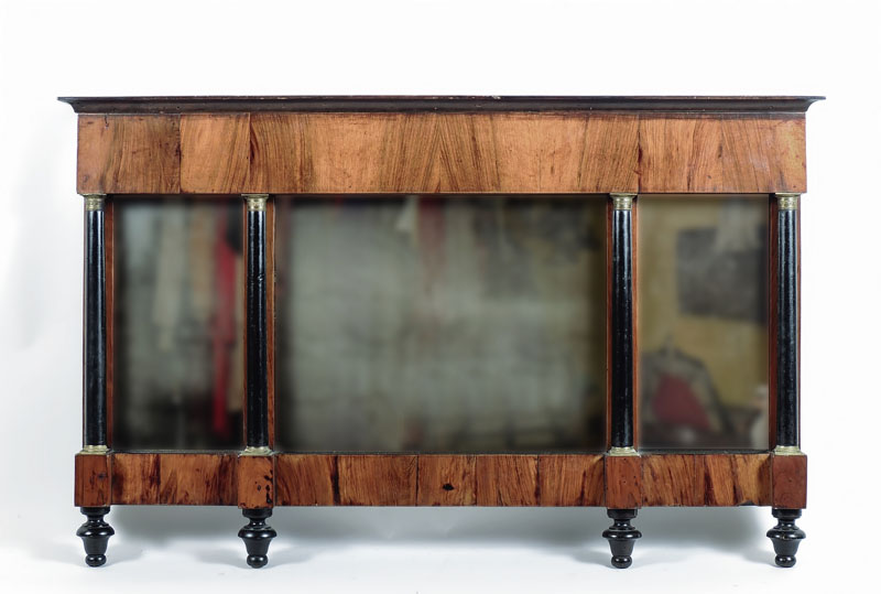 CAMINIERA IMPIALLACCIATA IN PIUMA DI NOCE - WALNUT VENEERED OVERMANTEL MIRROR inizio del XIX secolo - early 19th Century tripartita da lesene a colonna in legno ebanizzato con capitelli in metallo dorato, piedi a trottola h cm 80x129x7,5