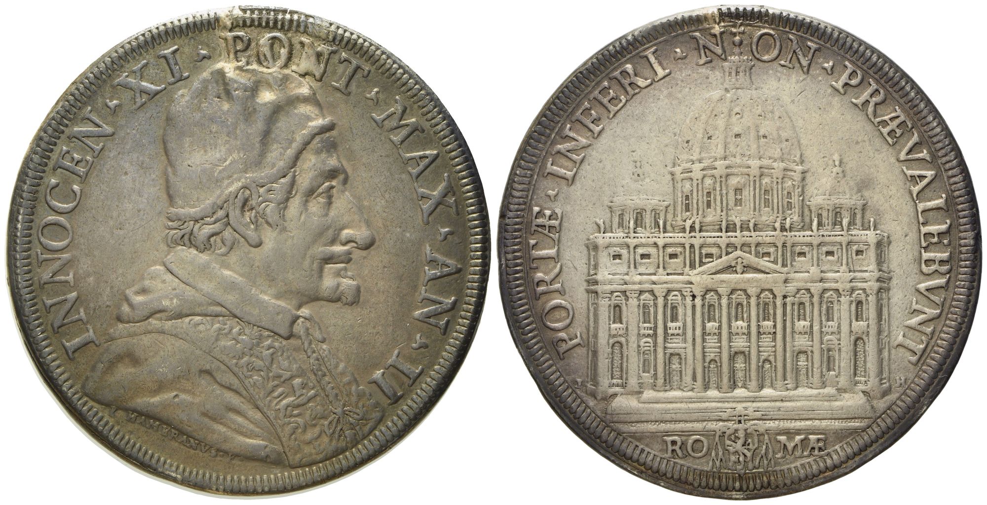 STATO PONTIFICIO. Roma. Innocenzo XI (1676 - 1689). Piastra, anno II "Basilica di San Pietro". Ag (31,76 g; 4,44 mm)