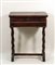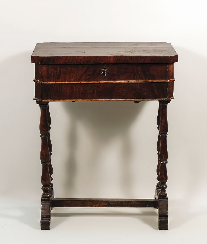 TAVOLINO DA LAVORO IN NOCE - WALNUT WORK TABLE piano da alzarsi, sostegni torniti su basi mosse riunite da traversa h cm72,5x58x42