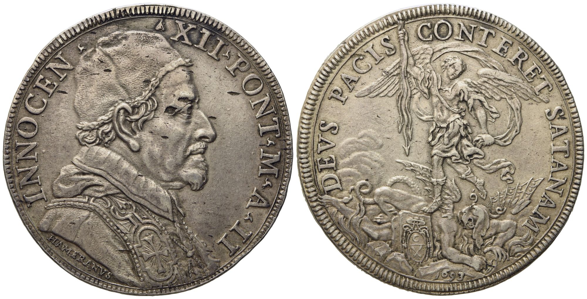STATO PONTIFICIO. Roma. Innocenzo XII (1691 - 1700). Piastra 1693 "San Michele Arcangelo". Ag (31,92 g; 44,6 mm)