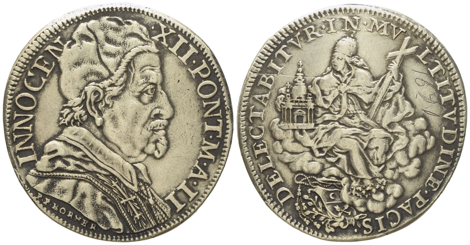 Lotto 413 | STATO PONTIFICIO. Roma. Innocenzo XII (1691 - 1700). Mezza piastra, anno II "Religione seduta sulle nubi". Ag (15,82 g; 36;7 mm)