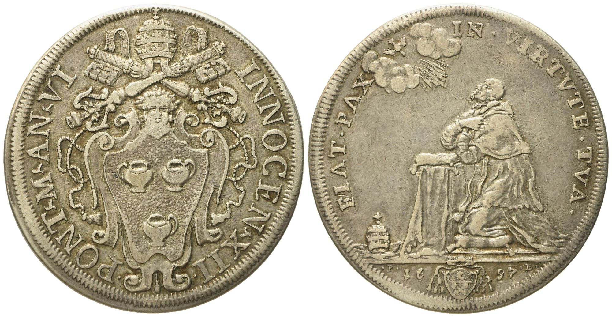 STATO PONTIFICIO. Roma. Innocenzo XII (1691 - 1700). Mezza piastra 1697 "Papa inginocchiato". Ag (15,85 g; 38,5 mm)