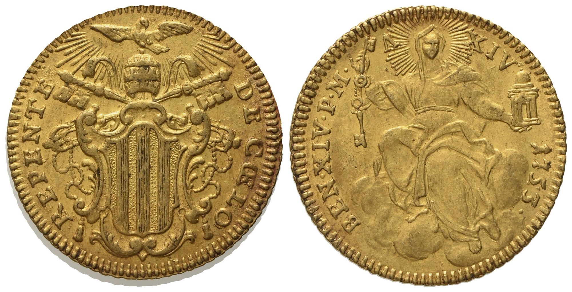 STATO PONTIFICIO. Roma. Benedetto XIV (1740 - 1758). Zecchino 1753. Au (3,41 g; 21,5 mm)