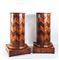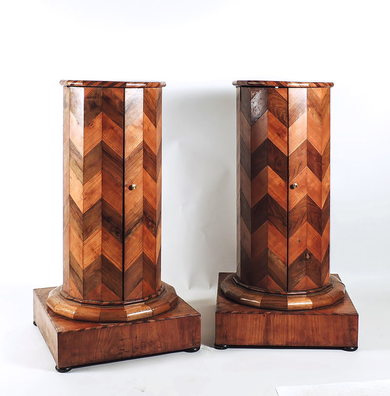 COPPIA DI COMODINI A COLONNA IMPIALLACCIATI IN NOCE E CILIEGIO - PAIR OF WALNUT AND CHERRYWOOD VENEERED COLUMN NIGHT TABLES prima metà del XIX secolo - first half of 19th Century piano impiallacciato con motivo di raggiera, fusto sfaccettato impiallacciato con motivo fiammato, fronte ad uno sportello, su base quadrata h cm 104x52,5x52,5