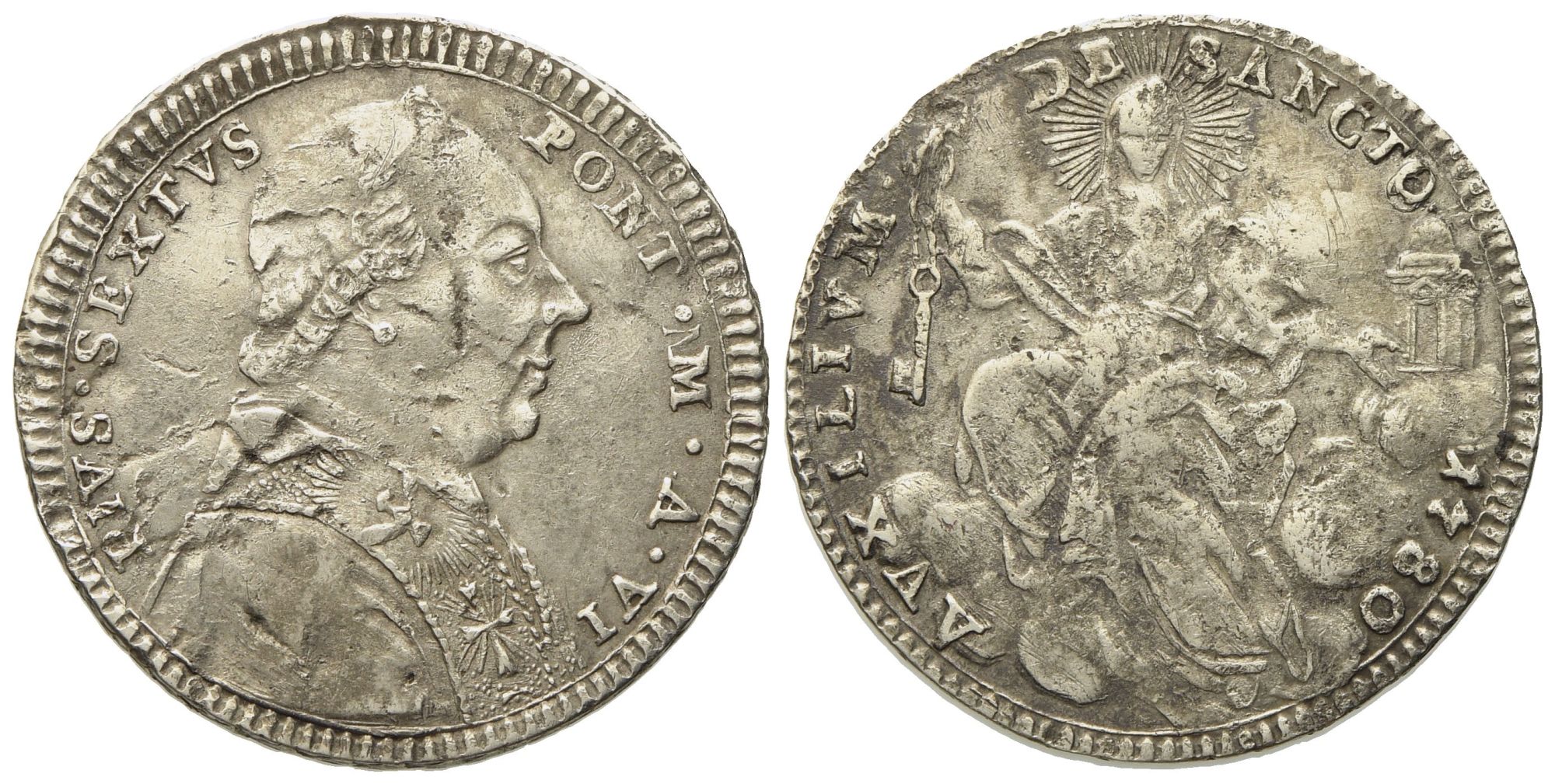 STATO PONTIFICIO. Roma. Pio VI (1775 - 1799). Doppio giulio, quinto di scudo 1780, anno VI. Ag (g 5,25; mm 25,3).