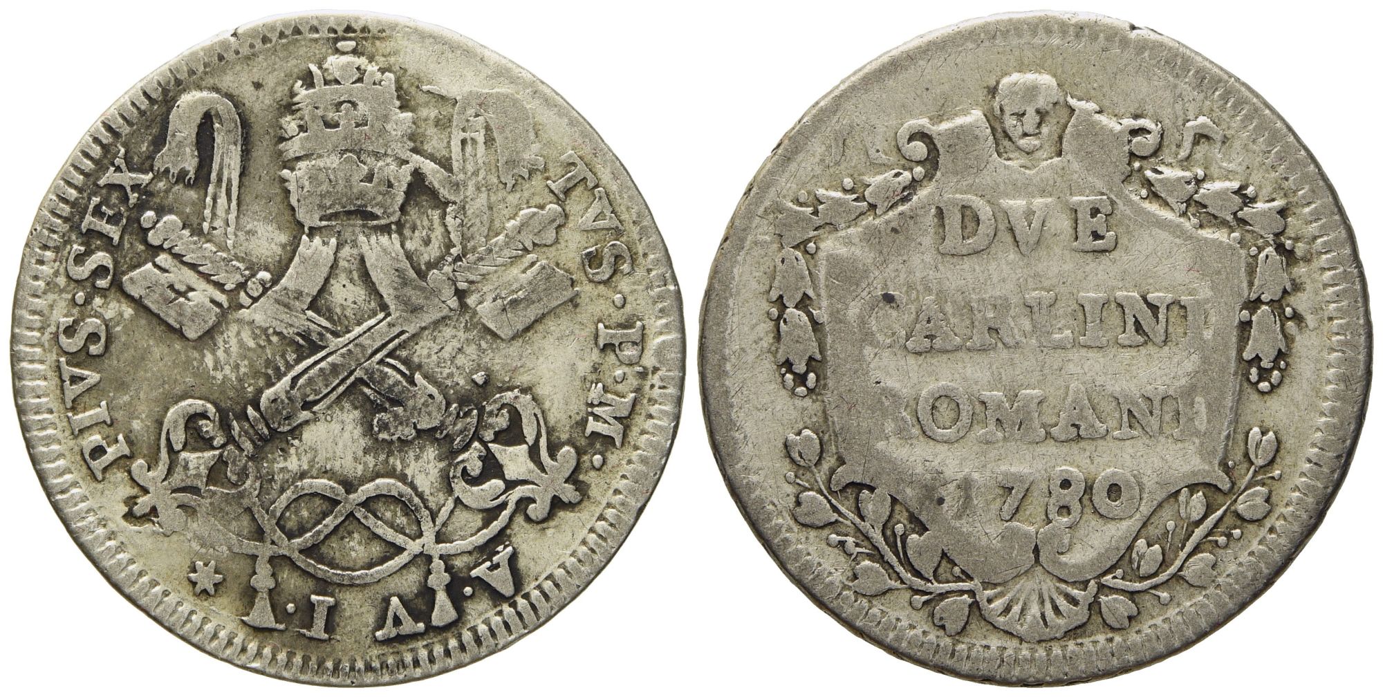 STATO PONTIFICIO. Roma. Pio VI (1775 - 1799). 2 carlini romani 1780, anno VI. Mi (g 5,42; mm 27,9).