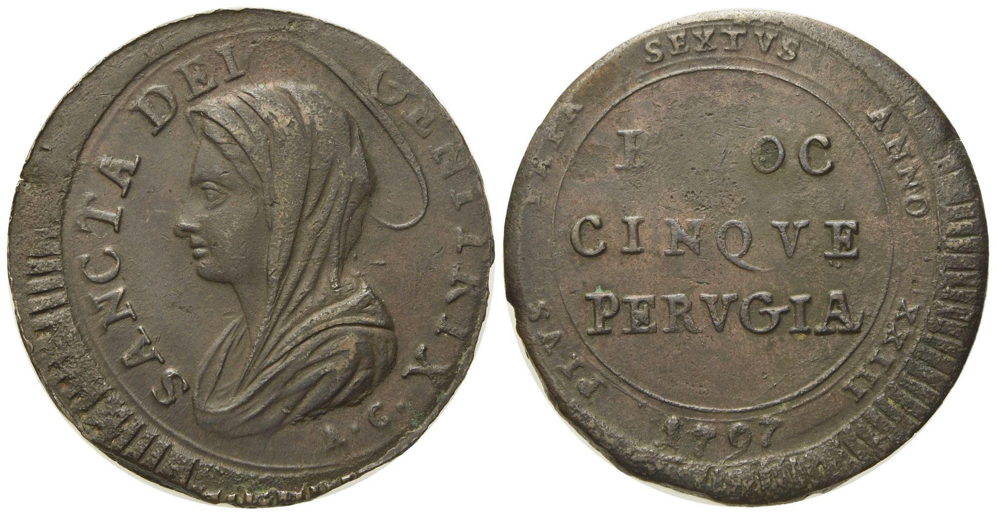 STATO PONTIFICIO. Perugia. Pio VI (1775 - 1799). 5 baiocchi 1797. Inc. "A.C.". Cu (13,01 g; 31,16 mm).
