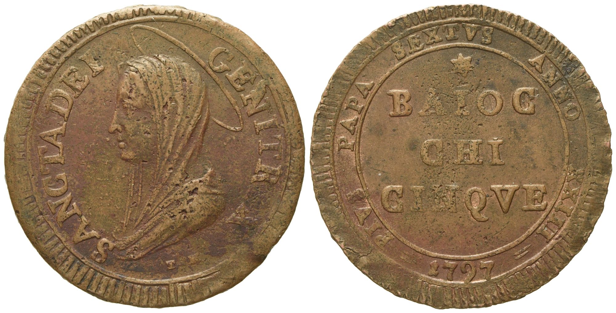 STATO PONTIFICIO. Roma. Pio VI (1775 - 1799). 5 baiocchi 1797, anno XXIII. Cu (g 18,97; mm 32,5).
