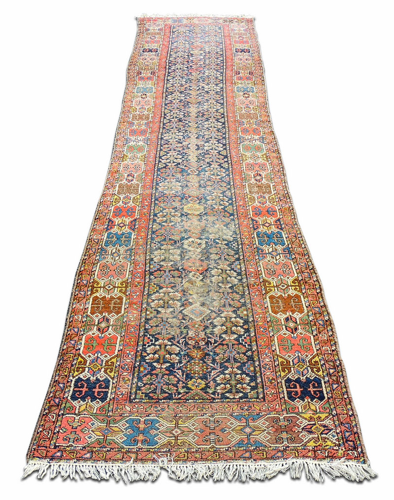 GALLERIA PERSIANA - LONG PERSIAN RUG fondo blu campo a motivi floreali e geometrici nei toni del rosso cm 500x100