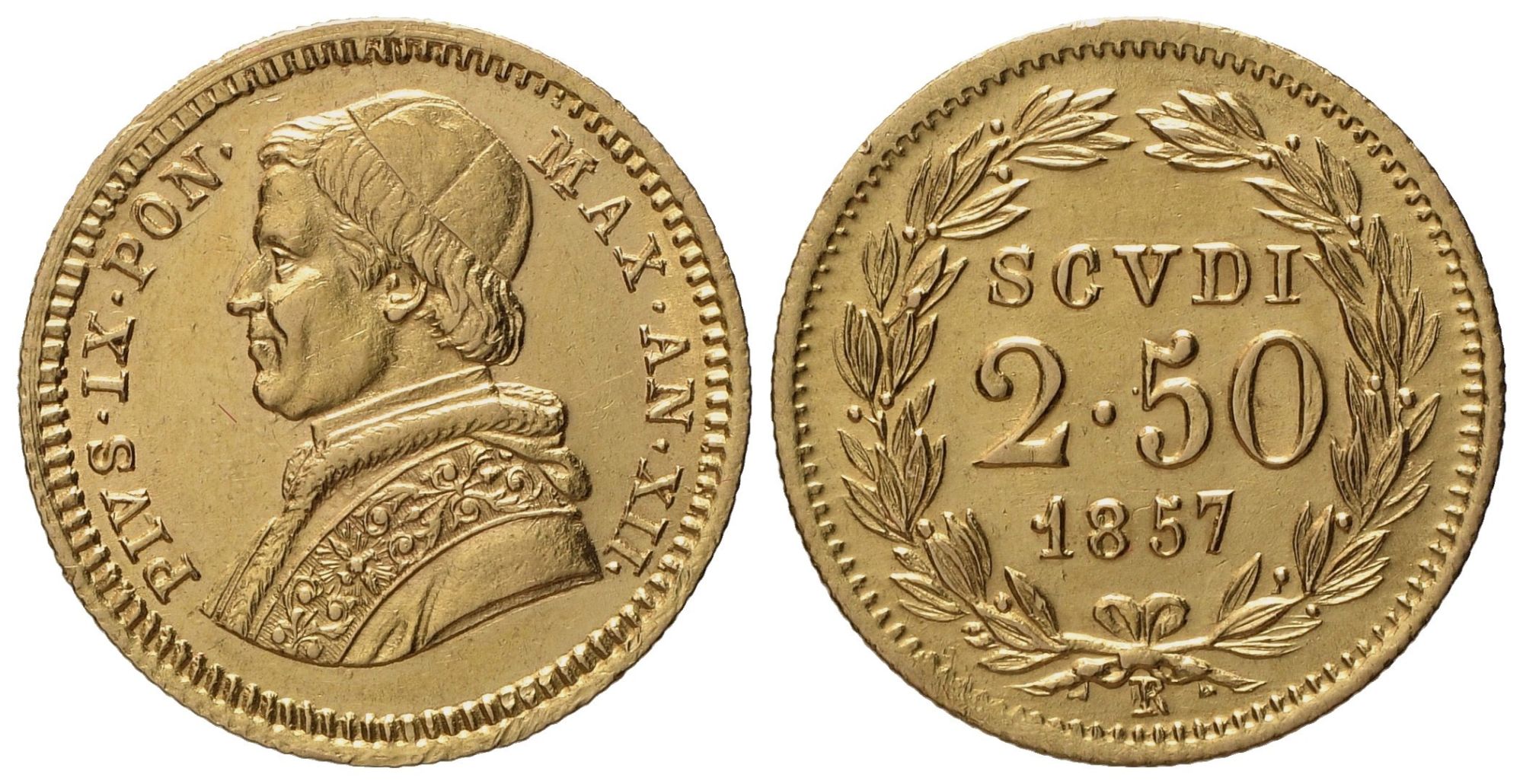 STATO PONTIFICIO. Roma. Pio IX (1846 - 1870). 2,50 scudi 1857 anno XII. Au (4,38 g; 18,5 mm)