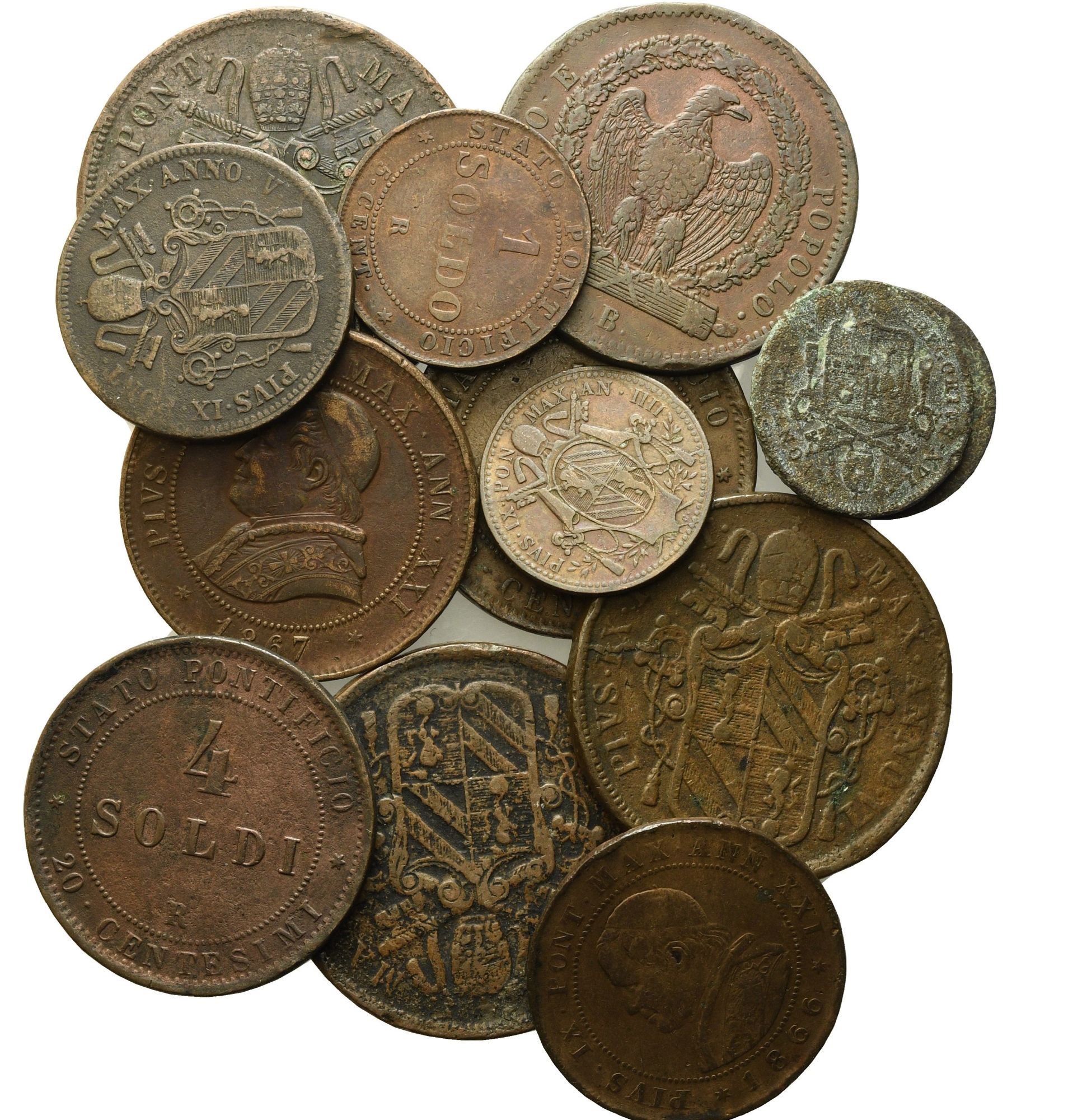 Precedente Lotto 580 Successivo Bertolami Fine Art - Piazza Lovatelli 1, 00186 Roma Asta 317 – Monete e medaglie medievali e moderne italiane ed estere Monete e medaglie medievali e moderne italiane ed estere giovedì 12 dicembre 2024 ore 12:00 (UTC +01:00) STATO PONTIFICIO. Roma. Pio IX (1846 - 1870). Lotto di n. 13 monete varie. Cu