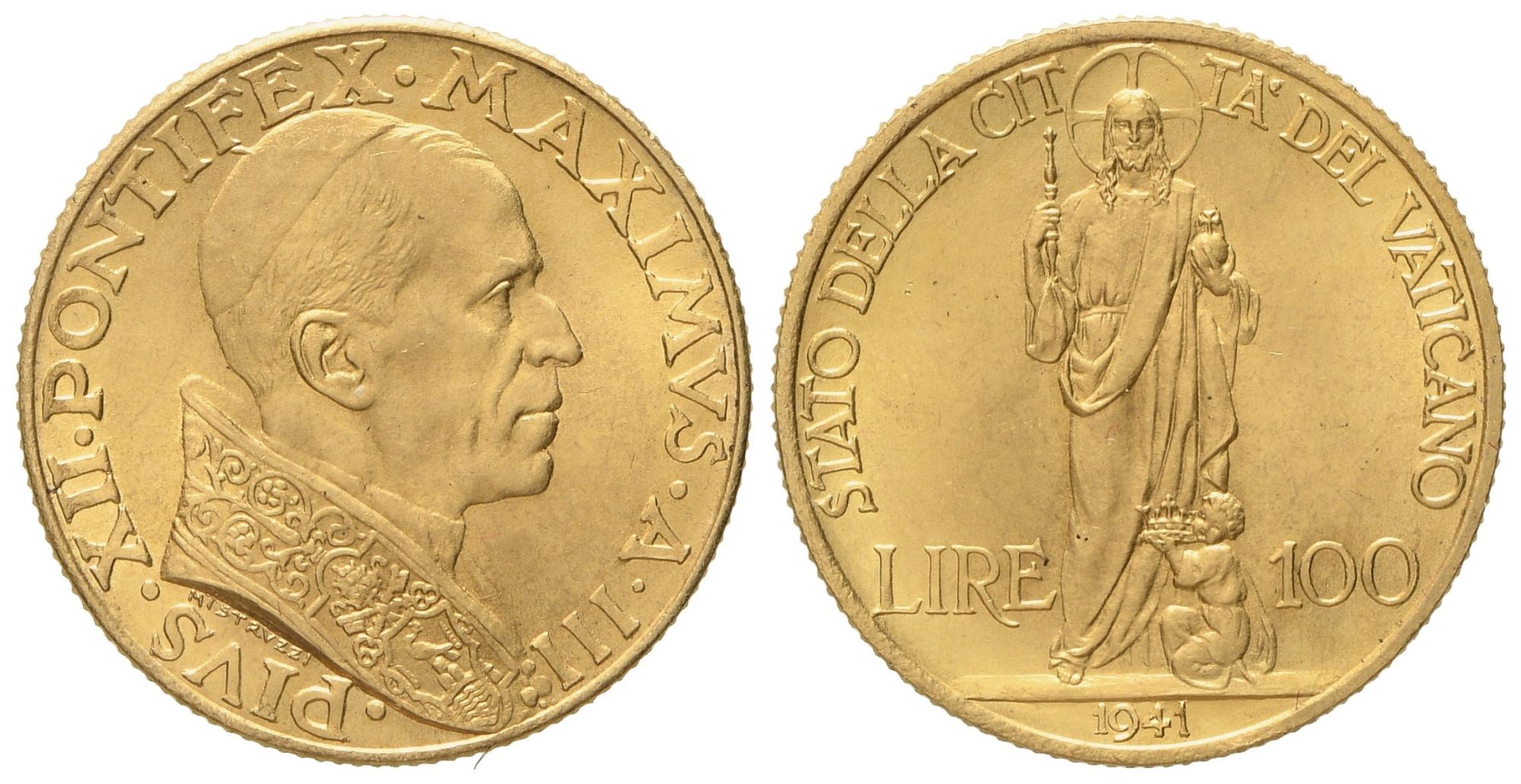 VATICANO. Pio XII (1939-1958). 100 lire 1941. Au (5,19 g; 20,4 mm)