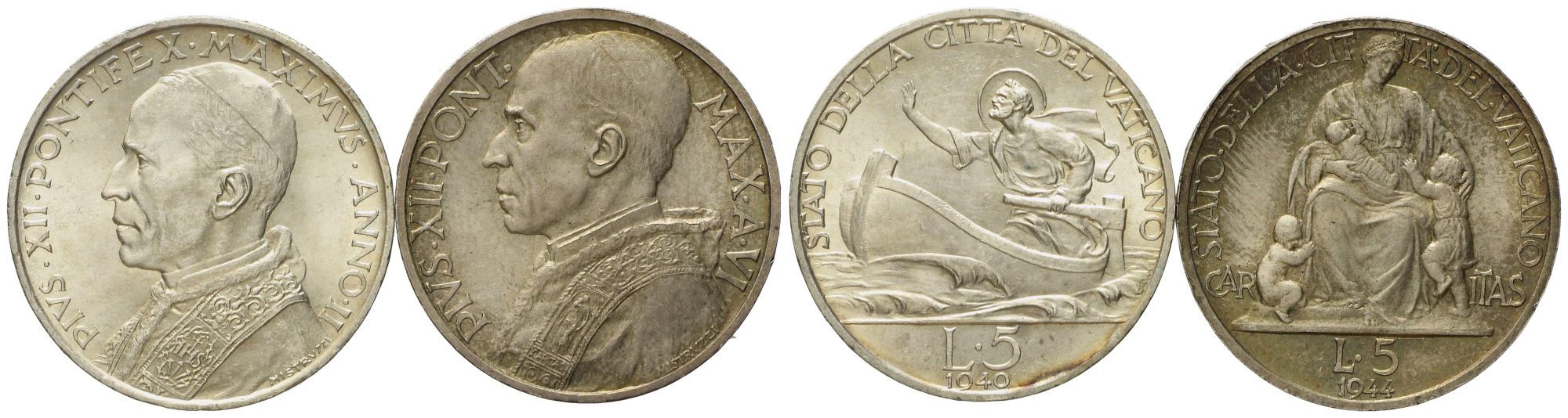 VATICANO. PIo XII (1939-1958). 5 lire 1940 - 1944. Lotto di due esemplari. Ag