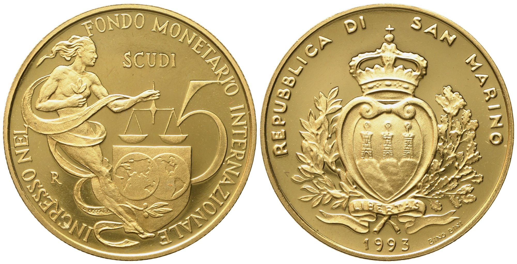 SAN MARINO. 5 scudi 1993. Au 916,66 (16,96 g)