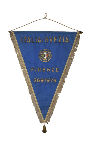 Italia - Svezia. Gagliardetto ufficiale dell'incontro amichevole giocato il 26 settembre 1979 a Firenze. Vittoria degli Azzurri per 1-0 con un gol di G. Oriali al quindicesimo minuto. Gagliardetto ricamato con filo color oro. Dimensioni cm 36x49. In buono stato. Official embroidered pennant from the match Italy vs Sweden played on 26th September 1979 in Florence. “Azzurri” won 1-0 on a goal by G. Oriali at 15th minute. Embroidered pennant with gold thread. Size cm 36x49. Good conditions.